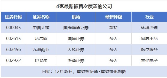 初度遮蔽方面,12月9日券商共给出了4次初度遮蔽。其中,中国天楹赢得国泰海通证券赐与“增捏”评级,哈尔斯赢得国盛证券赐与“买入”评级,九洲药业赢得天风证券赐与“买入”评级,伊戈尔赢得浙商证券赐与“买入”评级。